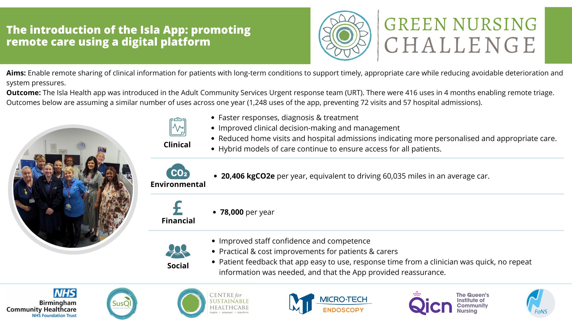 Digital tools like the Isla Health App can significantly enhance clinical decision-making, reduce unnecessary hospital admissions and home visits, and contribute to environmental sustainability. The project demonstrated that with strong clinical leadership, collaborative implementation, and a user-friendly platform, remote care can be effectively integrated into urgent community response pathways, aligning with NHS priorities for digital transformation and carbon reduction.