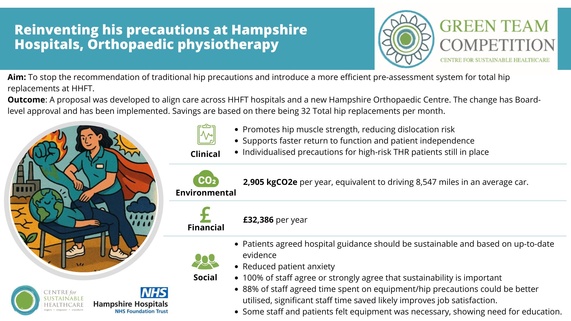 Removing hip precautions improves sustainability, reduces costs, and aligns care with evidence. Barriers include historic attitudes, consultant consensus, and small sample size. Risks of dislocation remain low and unchanged according to research. Change requires board-level approval, updated SOPs, and staff education. Wider adoption could standardise care nationally and improve patient experience while reducing environmental impact.