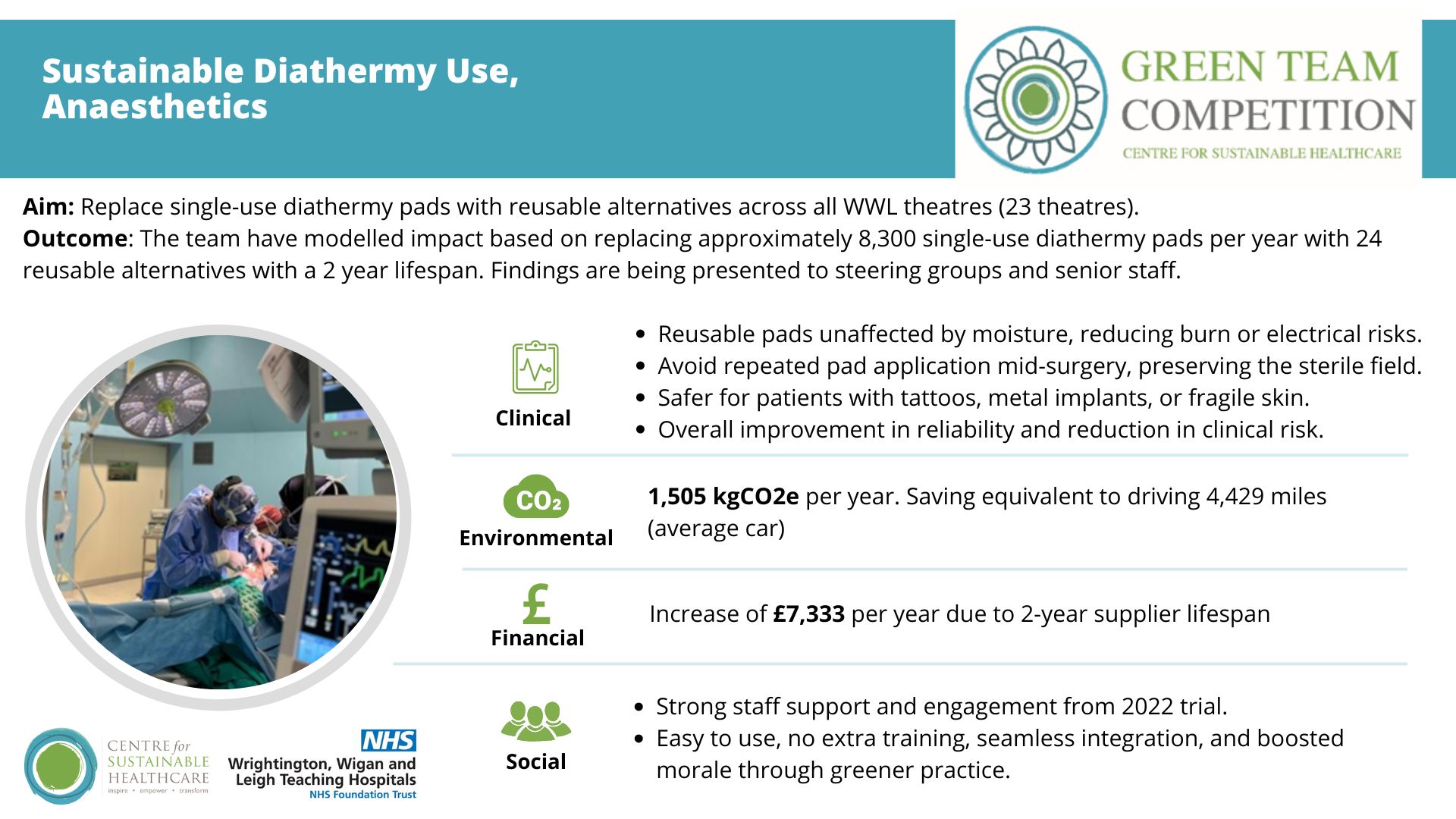 The team aimed to evaluate and plan a trust-wide switch to reusable diathermy return electrodes compatible with existing equipment. A previous trial in 2022 provided valuable data on compatibility, staff feedback, and clinical performance. The intervention involved modelling environmental and financial impacts, gathering procurement data, and preparing for stakeholder presentations to secure approval. Staff from multiple specialties trialled the reusable mats, and feedback was collected on usability, safety, and integration into current workflows. Procurement has confirmed compatibility and pricing, and the team is now seeking executive approval to implement the change.